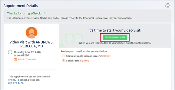 Click on the green Begin Video Visit button once the eCheck-In process is complete and within 15 minutes of your appointment start time. You must complete eCheck-In before joining the video visit.
